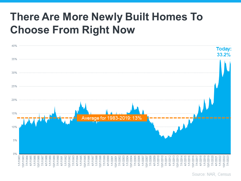 From 1983 to 2019 (the last normal year in the market), newly built homes made up only 13% of the total inventory of homes for sale. But today that number has climbed to over 33%.